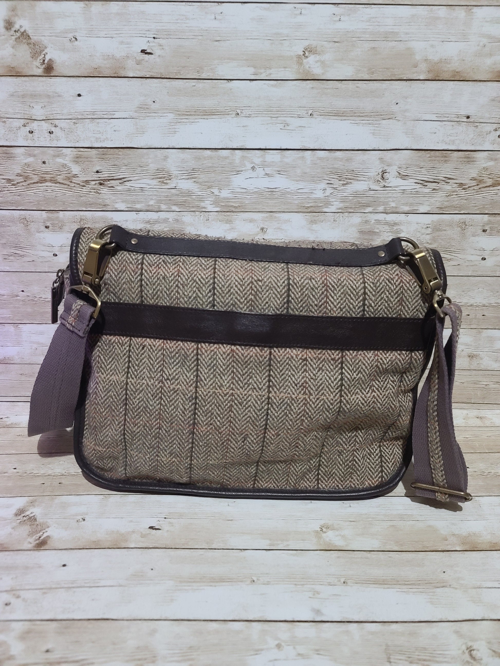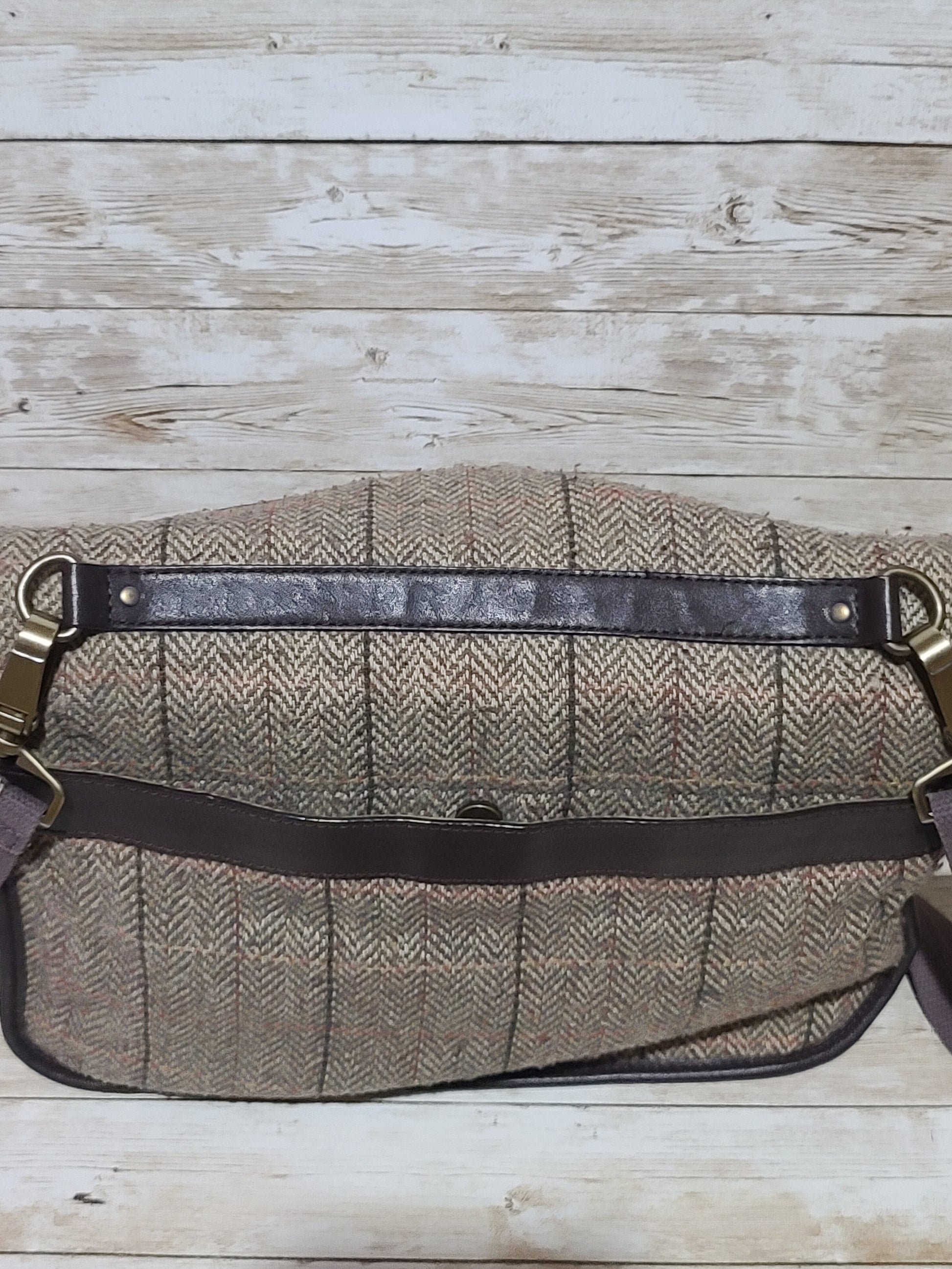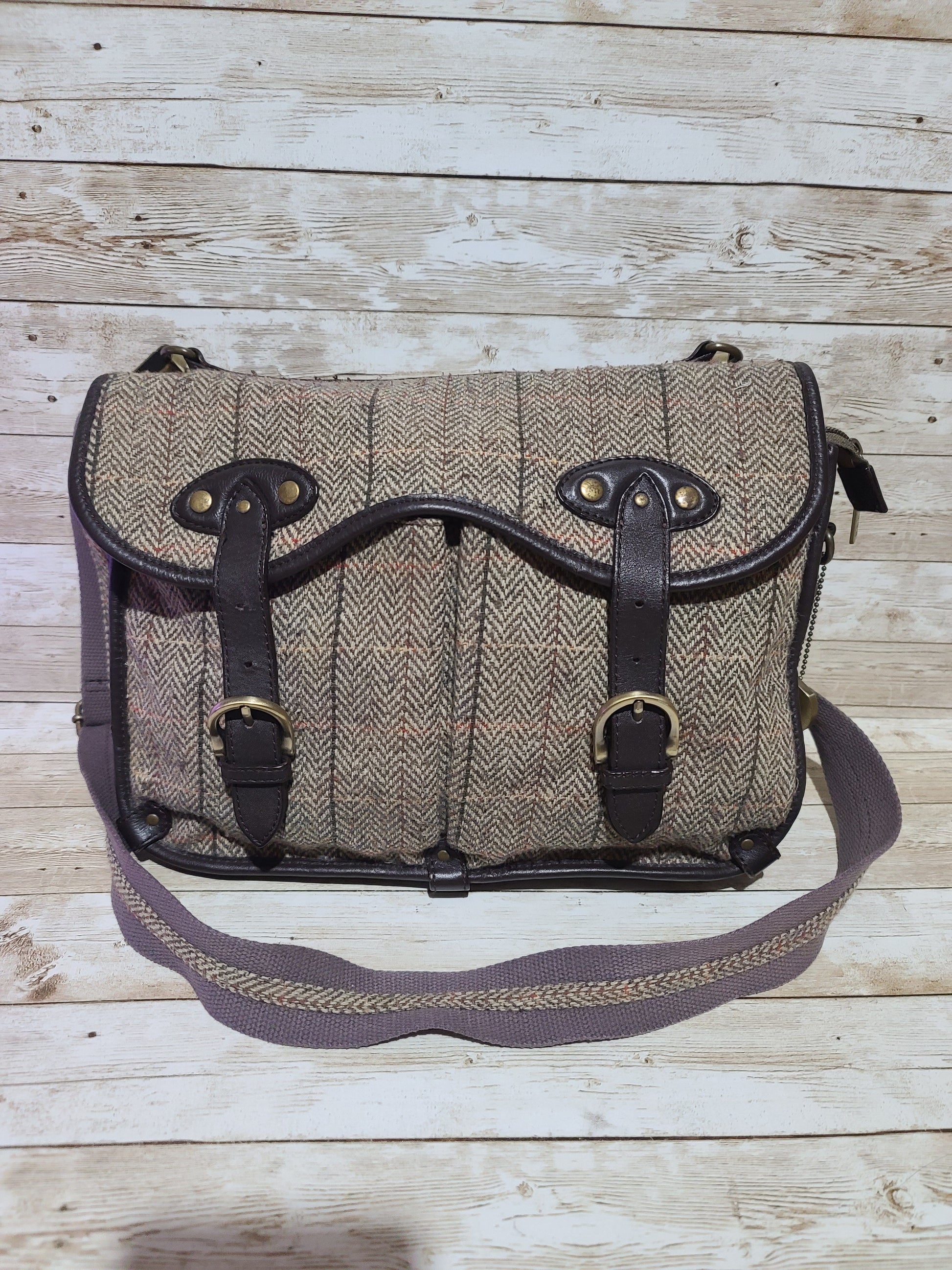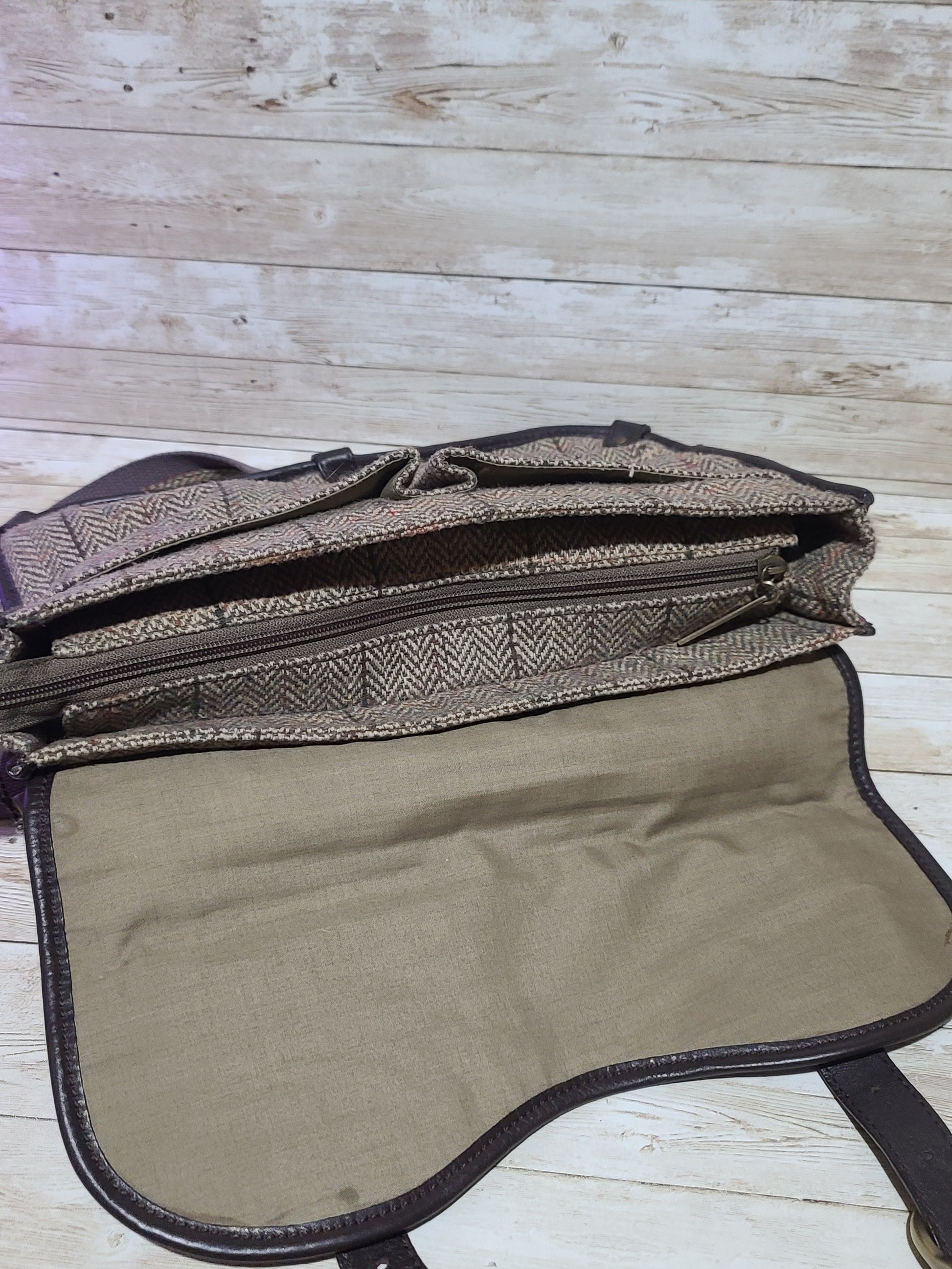 Dents Tweed & Leather Satchel Bag Brown Herringbone Crossbody Heritage 32cm Preloved