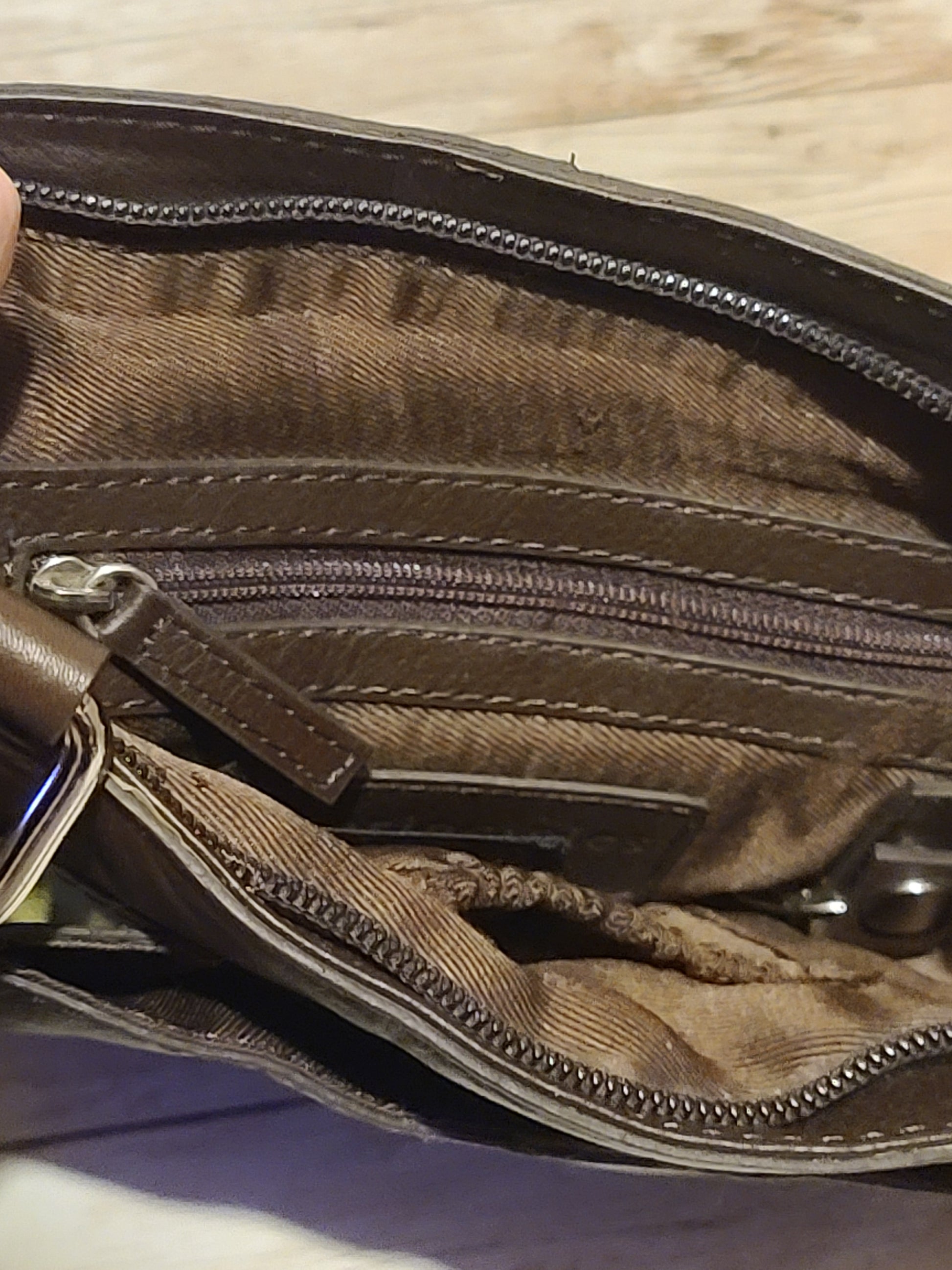 Genuine 100% brown leather crossbody bag with yellow trim detail. Brown canvas adjustable strap, secure zip top with inner zipped pocket,external magnetic side pocket and clean lined interior. Soft leather in very good condition with light normal wear and no damage.